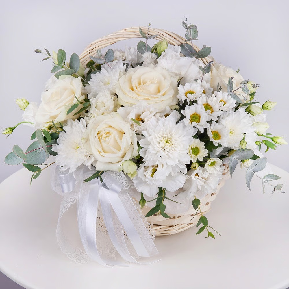Le bouquet se compose de lisianthus (eustoma), de chrysanthèmes et d'une rose blanche de 50 centimètres de long. Les fleurs délicates du lisianthus ajoutent une touche de romantisme au bouquet, tandis que les chrysanthèmes apportent des couleurs vives. La rose blanche, par sa beauté gracieuse, souligne l'élégance de la composition. L'eucalyptus cinerea donne au bouquet une fraîcheur et un agréable parfum.