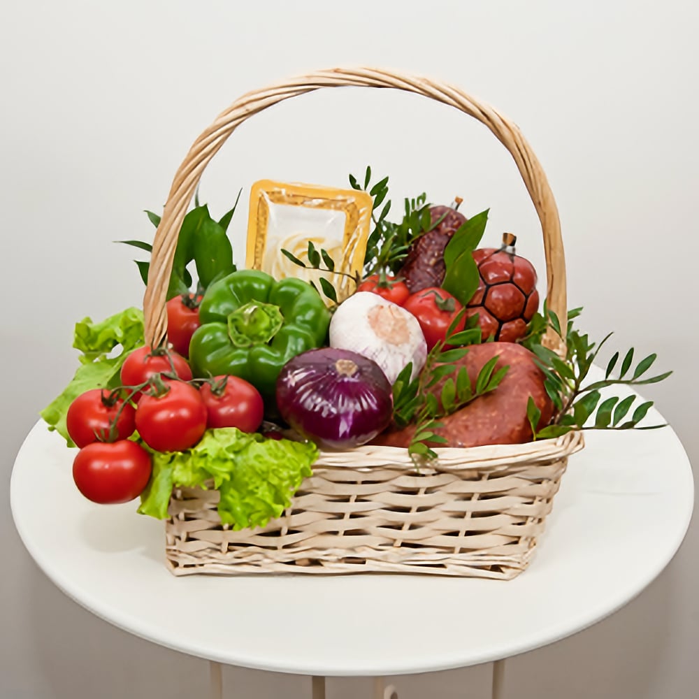 Ce cadeau original et appétissant deviendra certainement l'ornement de toute célébration ! Il n'est pas seulement incroyablement beau, mais aussi très savoureux. Le goût piquant de l'assortiment de viandes et de charcuteries est juteusement complété par la fraîcheur des légumes et les notes épicées de l'ail, pour que vous puissiez gâter vos proches avec une combinaison de saveurs exquise !