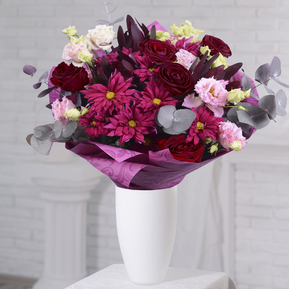 Ce bouquet original et lumineux mettra en valeur votre goût impeccable et donnera beaucoup d'émotions merveilleuses à votre destinataire. Les roses rouges et les chrysanthèmes, combinés à une verdure luxuriante, créent une composition inoubliable et délicieuse. Ces fleurs sont sûres de faire une surprise incroyable.