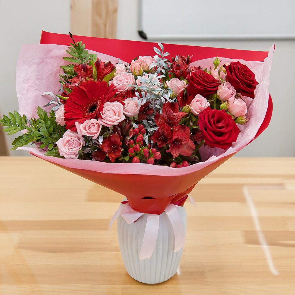 Ce beau bouquet est composé de différentes fleurs et éléments décoratifs qui ne manqueront pas de faire plaisir au destinataire. Le bouquet est composé de gerberas, d'alstroemerias, de roses buisson et d'une rose rouge de 50 cm de long. Une telle combinaison de fleurs donne au bouquet une atmosphère harmonieuse et joyeuse.