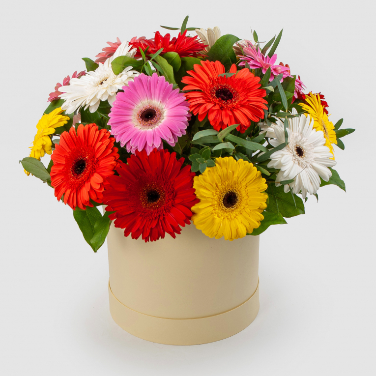 Les gerberas multicolores brillants personnifient les sentiments joyeux, la gentillesse et le bonheur, servent de symbole de la plénitude de la vie. Un beau bouquet dans une boîte à chapeau de 15 gerberas de couleurs différentes sera un excellent cadeau, conçu pour vous remonter le moral et vous souhaiter bonne chance et bonheur en tout.