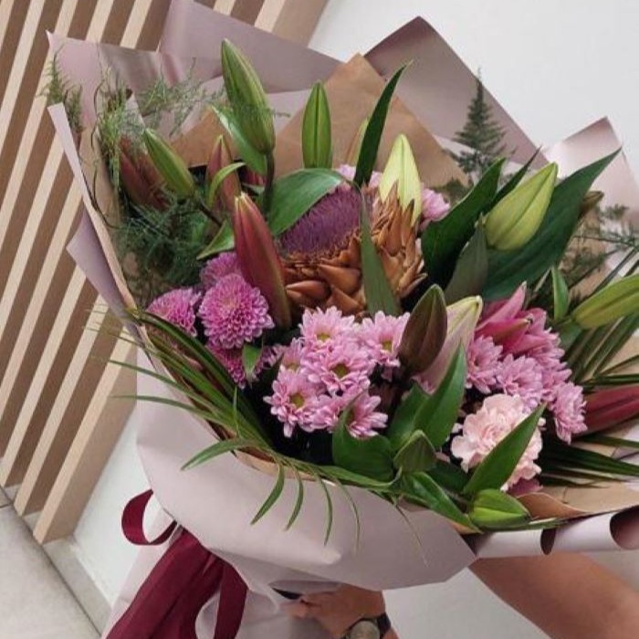 Chrysanthème - 4 pcs. œillets - 3 pcs. asperges - 2 pcs. robeline - 3 pcs. lys roses orientaux - 3 pcs. artichaut - 1 pc.