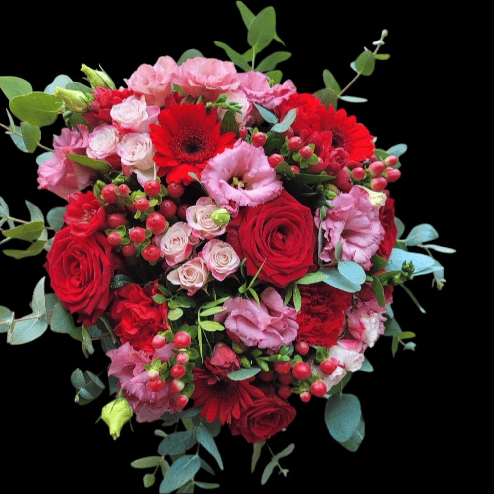 Resplendissant bouquet rond composé de fleurs variée rouge et rose
