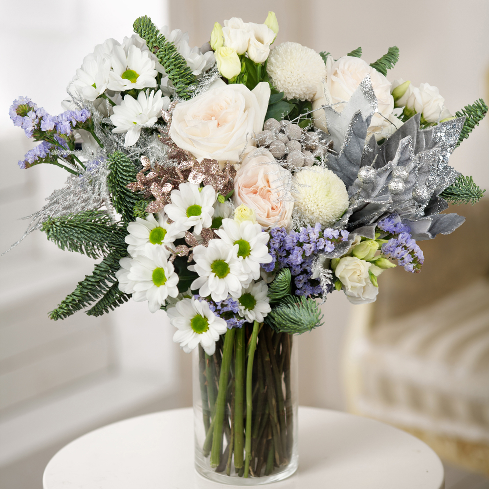 Comme un verre de vin chaud et épicé, ce bouquet de Noël donnera à vos proches des sentiments chaleureux. Une combinaison festive de roses blanches-neige, brunia, lisianthus et pompons de camomille, nichées au milieu de branches de sapin naturelles avec des accents glamour étincelants, fera une impression durable pendant les vacances.