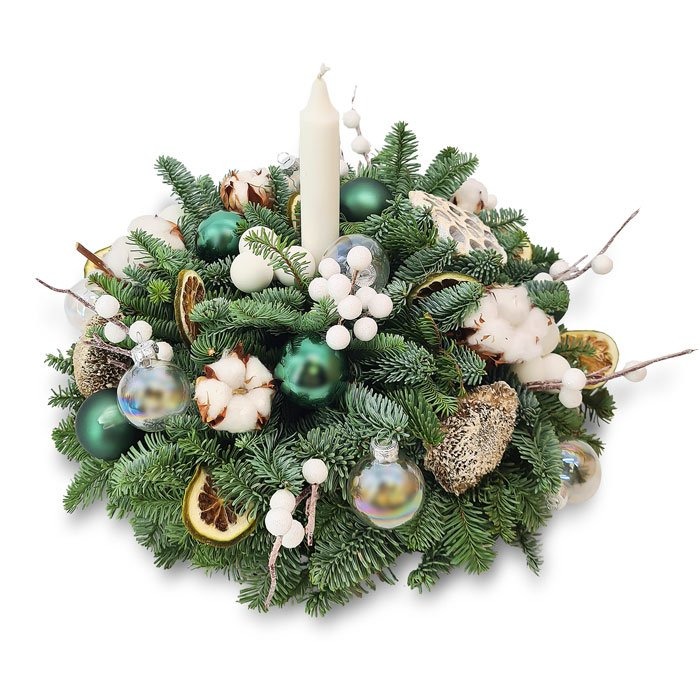 Composizione per la tavola di Natale, con candela, realizzata in abete e decorata con fette di lime, cotone, decorazioni secche, palline trasparenti e verdi Nel Fioraio con Storie, i bouquet e le composizioni sono progettati in modo incantevole e innovativo, destinato a trasmettere emozione e gioia. Foto con il titolo di presentazione: Le decorazioni possono essere leggermente diverse!