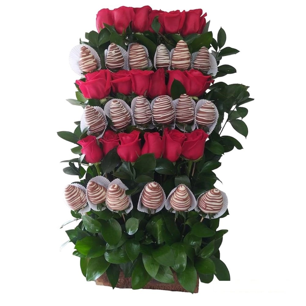 Échelonné sur une base rustique avec 18 roses et 18 fraises enrobées de chocolat