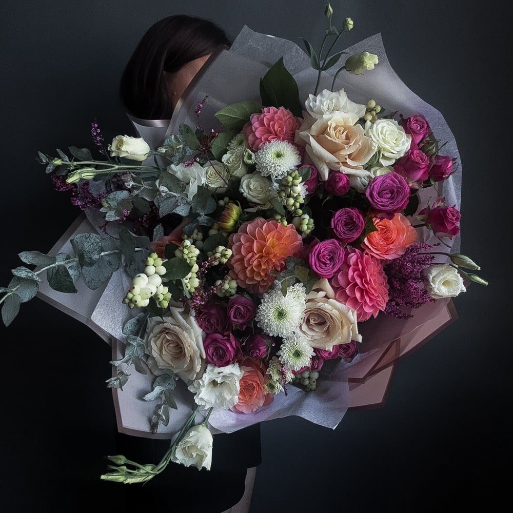 Bouquet mêlant des roses, des roses en spray, des dahlias, des roses en spray façon pivoine, du lisianthus et de l’eucalyptus. Taille : Large. Hauteur : 50 cm. Remarque : Nous travaillons avec des fleurs fraîches de saison, de sorte que la composition du bouquet peut varier légèrement. Même en l’absence d’une fleur de saison, nous nous efforçons de composer un bouquet aussi proche que possible du modèle. Si une fleur particulière est importante pour vous, contactez-nous par une note et nous conviendrons des options.