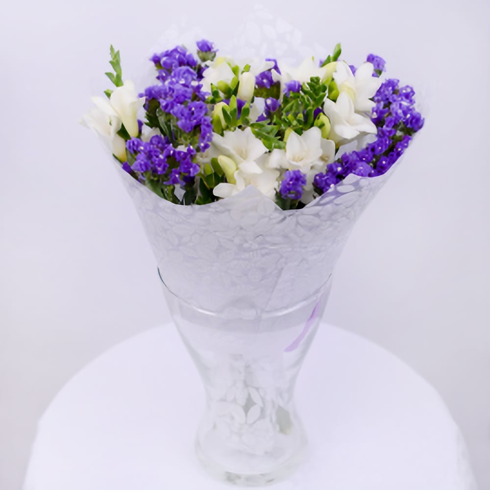 Bouquet 'Hauteurs Сélestes: Freesias Blancs et Staticas bleues'