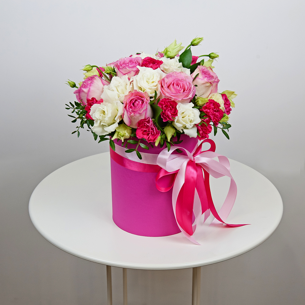 Envoyer une touche de couleur vive et faire votre spécial quelqu'un se sentir aimé avec ce bouquet de luxe! La combinaison enchanteresse de roses roses et blanches, de clous de girofle rose vif et de lisianthus blancs délicats présentés dans une boîte à chapeaux rose vif impressionnera certainement votre destinataire spécial!