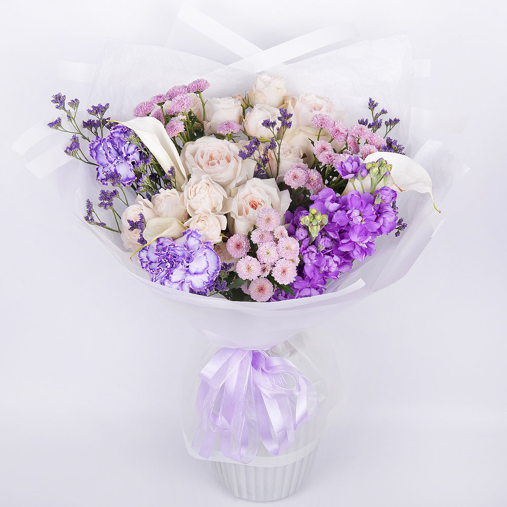 Le bouquet "Jardin Mystérieux" est une combinaison étonnante de roses pivoines, de callas, d'œillets, de matthiolas, de chrysanthèmes buissonnants et de limonium, créant une atmosphère de mystère e...