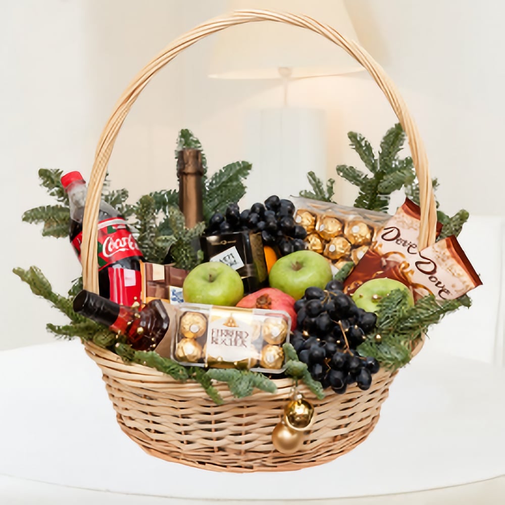 Ce panier magnifique et très impressionnant est plein de nourriture délicieuse et p! Les pommes mûres, la Grenade juteuse, les raisins sont mélangés avec des bonbons appétissants luxueux et encadrés…