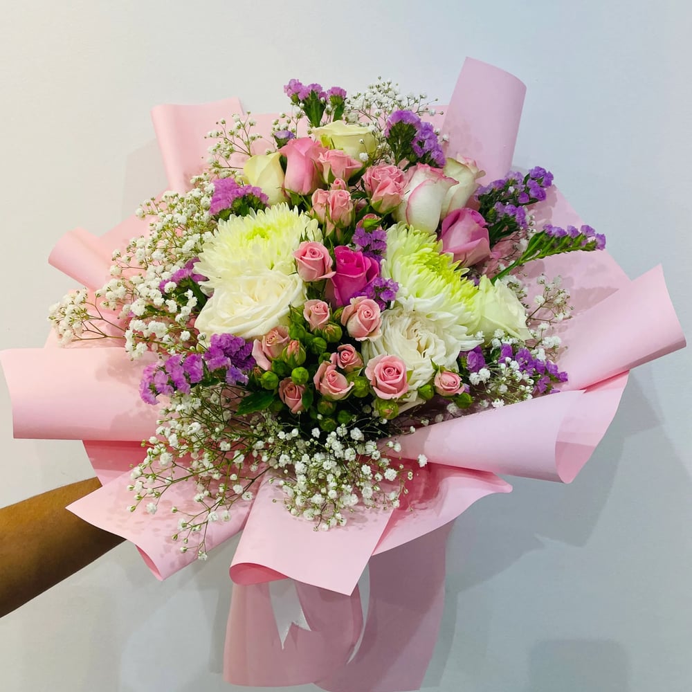 Bouquet joliment emballé composé de deux chrysanthèmes blancs à tête simple, deux roses crème, cinq roses spray couleur rose, trois roses bicolores couleur rose, trois roses Revival Pink, trois statices bleues, trois statices violettes et sept tiges de gypsophile blanche.