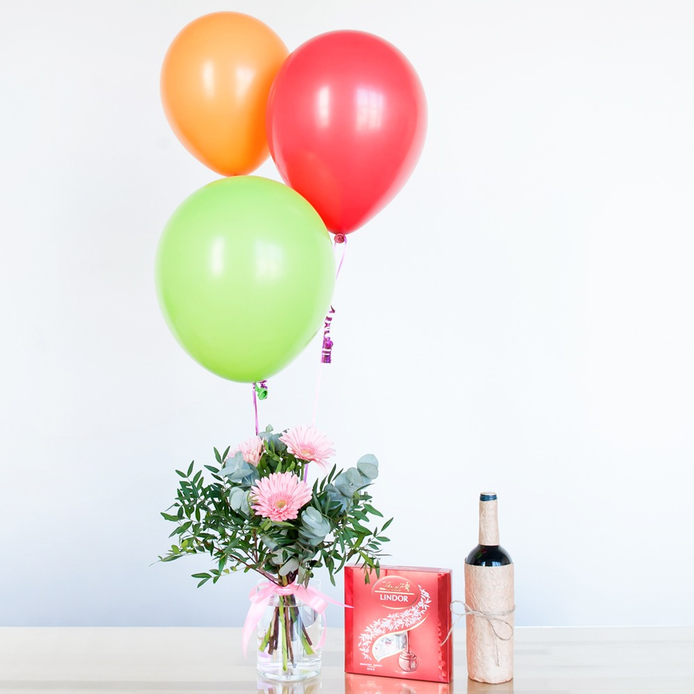 If you want them to have a perfect celebration, take a look at this impressive gift set. Fresh flowers, fine wine, mouth-watering chocolates and bright balloons will make a beautiful gift for a special occasion.