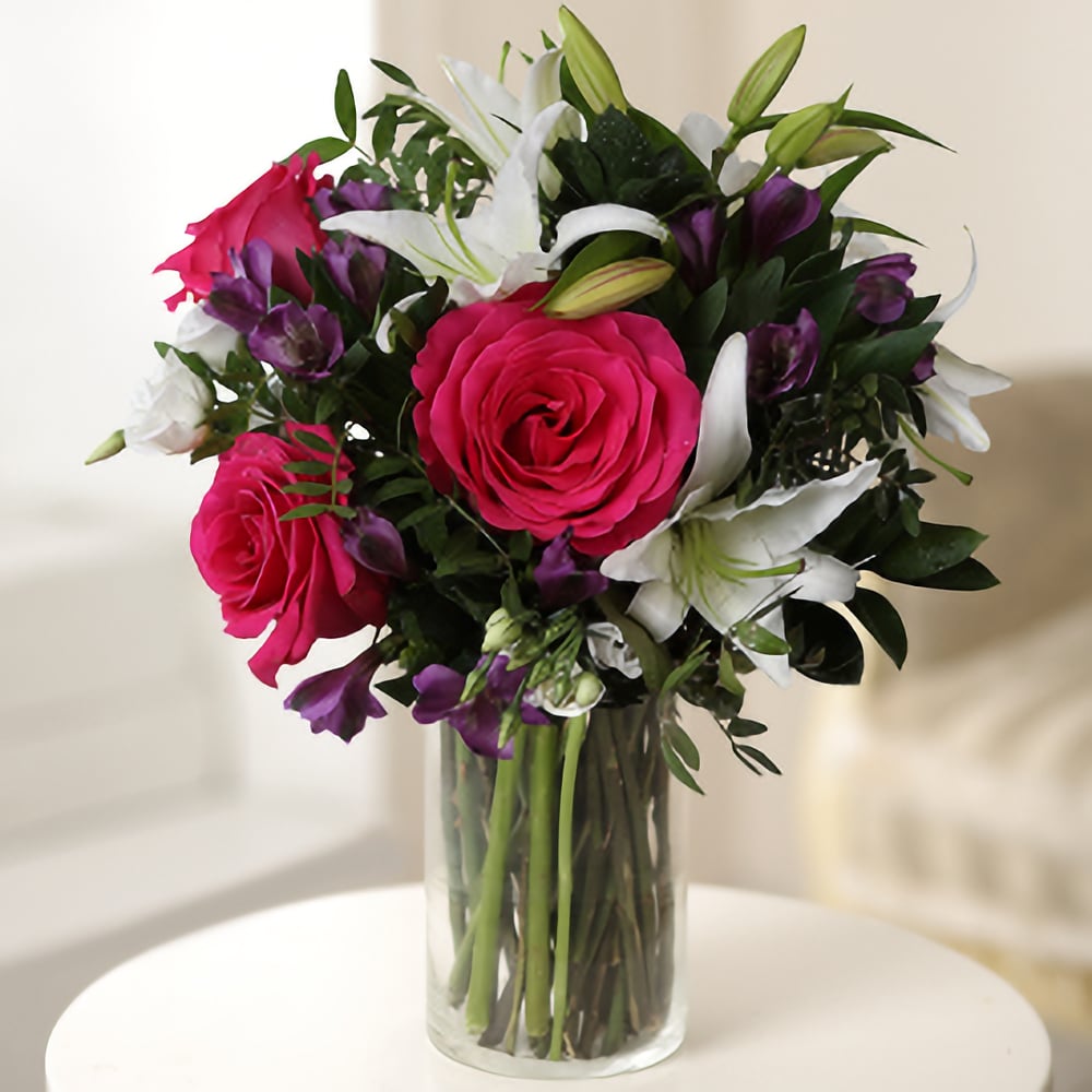 Lys doux, roses écarlates, lisianthus doux et lis péruviens sensuels pour un quatuor exquis. Chaque fleur est pleine d'amour et de chaleur. Exprimez vos sentiments délicatement!