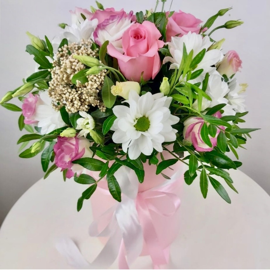 Le bouquet "Ma Tendresse" dans une boîte à chapeau est l'incarnation de la tendresse et du soin, le cadeau idéal pour les moments les plus importants. Le bouquet est composé de lisianthus, de chrysanthèmes blancs en buisson "Santini", de bouvardia, de roses roses, de pistache et de ruscus. Ces fleurs se combinent harmonieusement entre elles, créant une composition unique. Les lisianthus symbolisent la tendresse et la pureté, les chrysanthèmes blancs en buisson "Santini" ajoutent de l'élégance et de la grâce au bouquet, la bouvardia apporte de la fraîcheur et de la légèreté, les roses roses représentent la beauté et la tendresse, la pistache la chaleur et le confort, et le ruscus la fraîcheur et le naturel. Le bouquet "Ma Tendresse" dans une boîte à chapeau sera un magnifique cadeau pour un anniversaire, un jubilé ou toute autre célébration. Il convient également pour exprimer l'amour, la gratitude ou simplement comme un signe d'attention. La boîte à chapeau donne au bouquet un charme particulier et de l'élégance. Elle deviendra un complément stylé à tout intérieur et permettra de conserver la fraîcheur des fleurs pendant longtemps. Nous garantissons la haute qualité de nos bouquets et une livraison ponctuelle. Permettez-vous ainsi qu'à vos proches de profiter de la beauté et de la tendresse du bouquet "Ma Tendresse" dans une boîte à chapeau!