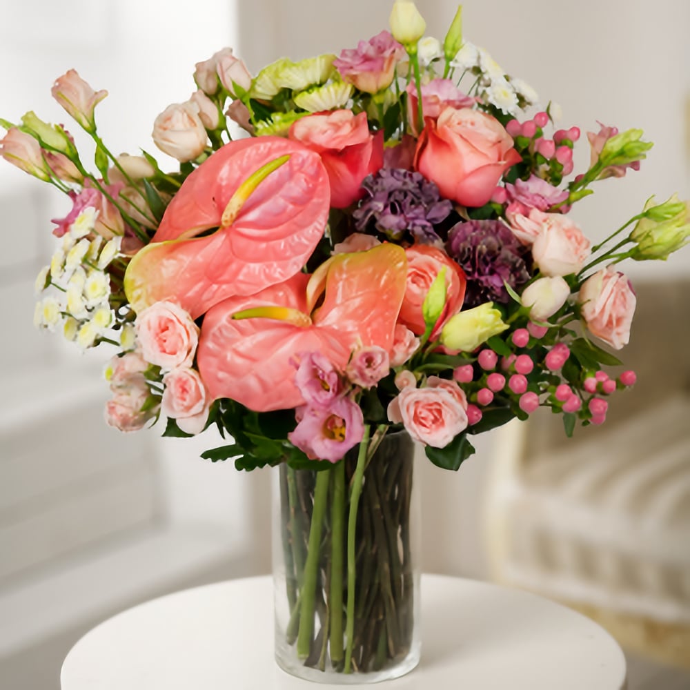 Ce magnifique bouquet fleurit avec des couleurs tendres et sophistiquées pour créer une impression durable sur votre destinataire! L'anthurium rose tropical, les roses Kahala, les lisianthus roses et les baies d'hypericum sont entourés de minuscules chrysanthèmes en aérosol et d'œillets violets rares. Enveloppé dans un film mat luxueux, cet arrangement floral a été créé pour les moments les plus spéciaux.