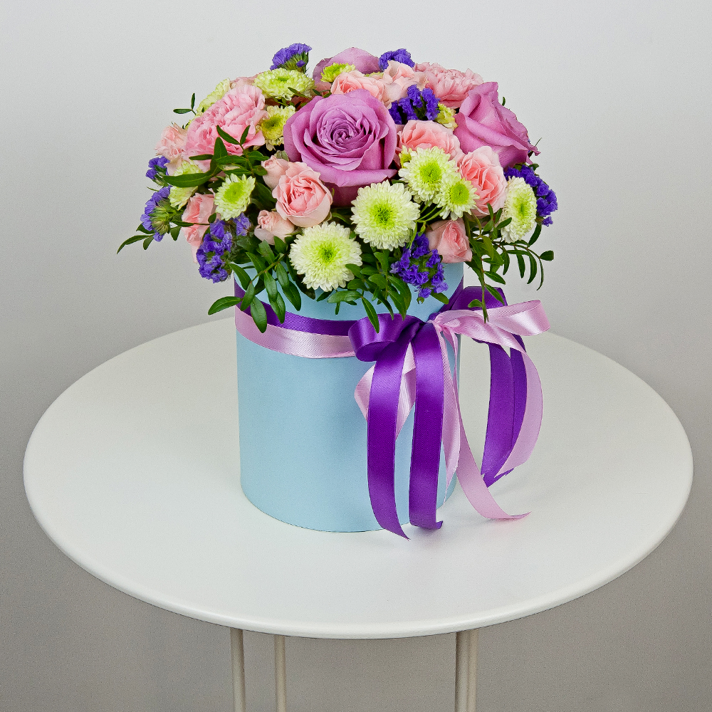 Célébrez n'importe quel événement avec une composition florale brillante et belle! Un mélange passionnant de roses violettes et roses, d'œillets roses clairs, de fleurs statiques bleues et de chrys...