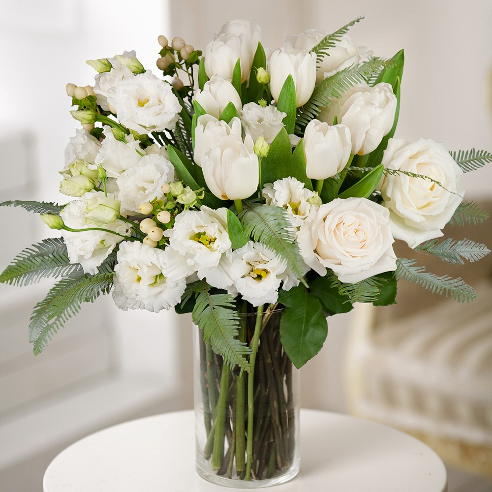 Create a special moment with this luxurious arrangement of white tulips, roses and lisianthuses. No matter what the occasion is, it will make its recipient’s day.