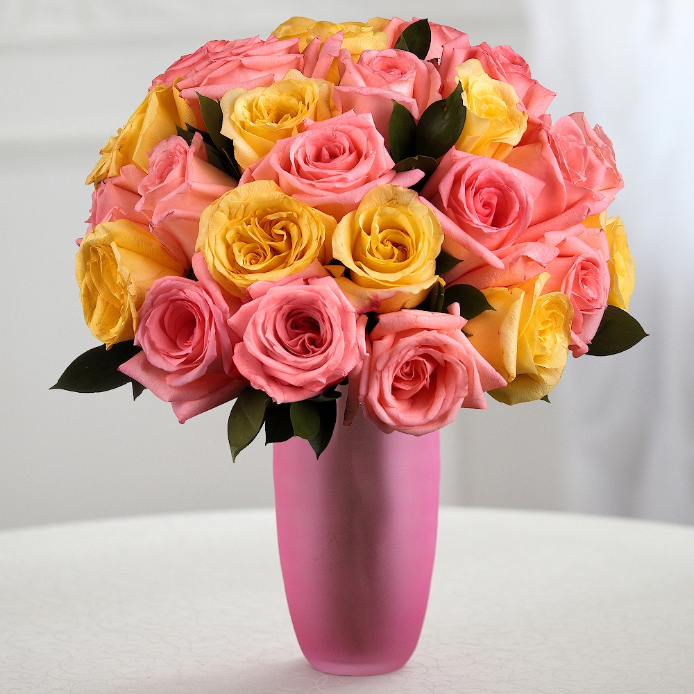 Bouquet de 25 roses roses et jaunes