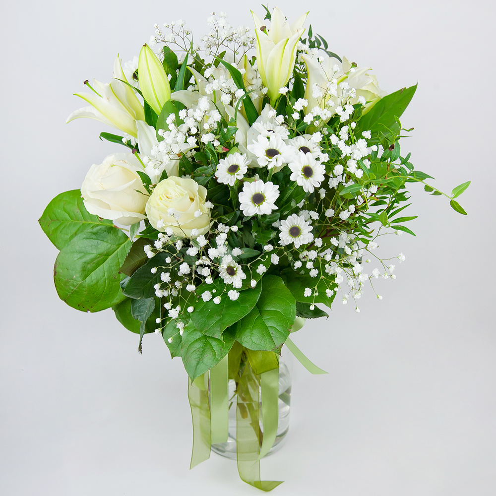 Léger et aérien, ce bouquet de roses blanches, de chrysanthèmes en spray et de lys parfumés fait un magnifique cadeau pour tout destinataire et pour toute occasion.